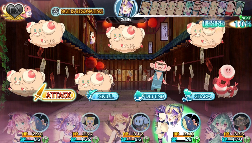 It doesn't take long to realize than Moe Chronicles is hell-bent on forcing the player to go harem and to play with as many Monster Girls as possible, switching them at will and trying all sorts of party combinations. And truth must be told, this is actually the game's strongest point: the Monster Girls' abilities are so incredibly varied and so perfectly complementary that combining them is a joy rather than a chore and produces more often than not parties with a stellar alchemy. And stellar it should be, because this is a game that forbids solo runs—or any run involving less than a five-member party, for that matter. I was a bit crestfallen when discovering that, but quickly got over my disappointment when I realized that XP was attributed equally to all party members and not divided between them. (For instance, if a fight yields 10XP, each of the five party members will get 10XP and not just 2XP like in most RPGs.) To make switching between party members even smoother, newly recruited Monster Girls don't start at Lv.1 but rather at a level similar to the one of your party members, and the Monster Girls that are part of your roster yet not in the party still gain a modicum of XP—and that amount can be increased by refurbishing their rooms. But the game goes even further in its dedication to introduce the player to the joys of party-switching: should you decide to stick with the same party from beginning to end, this is made impossible by the implementation of what can only be described as planned obsolescence in the Monster Girls.