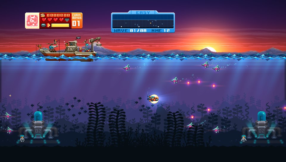 However, my actual gameplay experience with Aqua Kitty was nowhere near as frantic and elating as I had fantasized. My trip through the game's hazardous waters was a bit of a trudge, and this was solely due to questionable game design. Take the level design, for instance: instead of featuring an automatic scrolling, zones loop and can be navigated indifferently from left to right or right to left. While this gives the player a bit of leeway by letting them choosing their direction and speed, it also removes the stimulating feeling of urgency generated by an automatic scrolling. I found myself looping through the zones and meeting the same waves of pesky enemies over and over again until I got sick of them. And talking about enemies, they are the meat and potatoes of the game, since you can only exit a zone once you've been scouring it of all the resident pest. No rushing towards the end of the stage and dodging half of the aerial obstructions in heroic dashes in Aqua Kitty: you're basically a marine janitor, and you won't go anywhere until you've cleared all the trash floating around. I don't know about you, but I find that gameplay premise a tad anticlimactic.