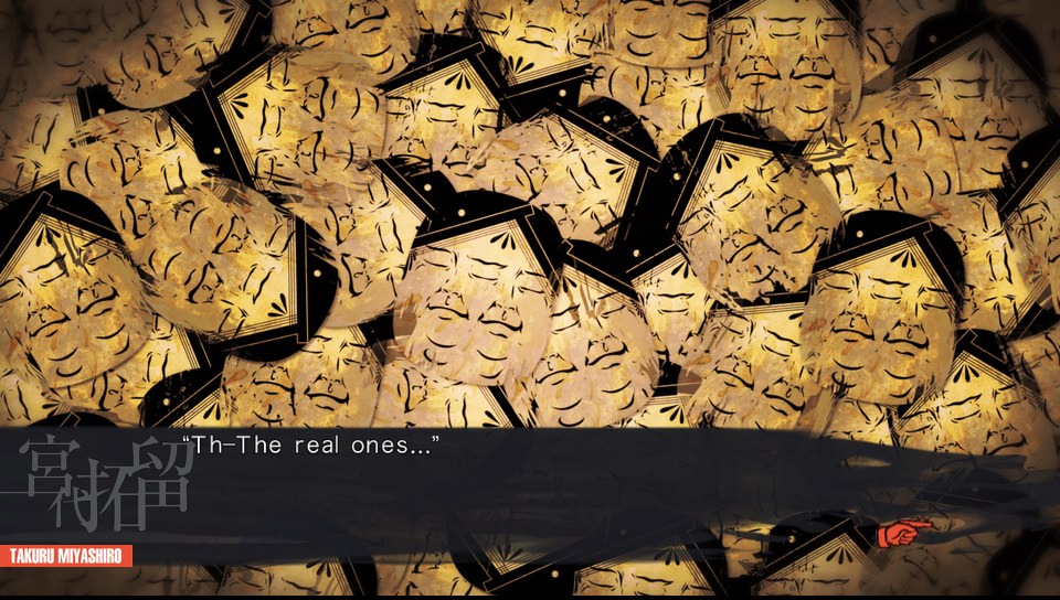 The "Gimme More" side: The story and atmosphere are absolutely mesmerizing. This is hands down the best VN I've ever read, putting to shame Steins;Gate and even favourite otome VNs of mine such as Bad Apple Wars and Norn9. Not only did Chaos;Child regaled me with its mind-blowing story, its enthralling atmosphere and its charismatic characters, but it also treated me to a delicious millefeuille of plot twists, most of which I didn't anticipate at all. Now that's what I crave from a suspense story, be it a VN, a book or a film: developments that I don't see coming miles ahead and plot twists that make shivers run up and down my spine and leave me gaping.