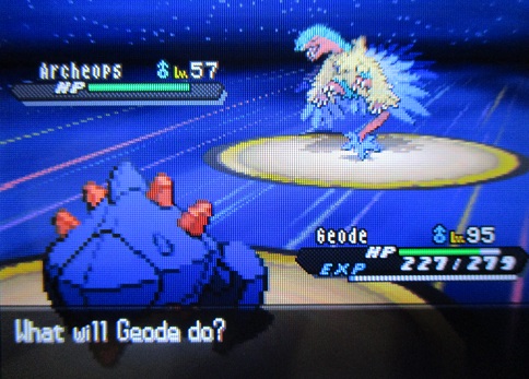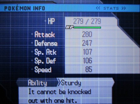 Mind you, I did my homework beforehand. Endurtaking exciting challenges is all well and nice, but I had to make sure that a Roggenrola solo run was even possible at all before digging up my cartridge of Black 2 from my precious collection. I pored over the little rock's Stats on Bulbapedia; and lo and behold, it turned out that Roggenrola actually had a couple of cards up his sleeve stat-wise — cards that could make him more than fit for cruising solo. For one thing, he boasts a stellar Attack stat, which means guaranteed one-shooting; for another, he's blessed with high Defense and loads of HP, which allows him to be a damage sponge and take hits comfortably. This automatically took care of the cute geode's crippling weakness, i.e. his abysmal Speed stat: even though I never got to act first in battle, I would still be able to stomach my opponent's hit before unleashing my own devastating moves. Last but not least, Roggenrola's Sturdy ability ensured that my little rock would never be one-shot at the beginning of a battle. There was definitely some potential there, and good hopes that I could indeed succeed and pull off a Roggenrola Solo Run.