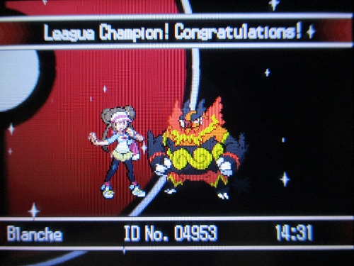 My lovely little Bacon did a great job in all things fighting, one-shooting his way to the Elite Four and generally treating all other 'Mons like insignificant obstructions. He was Lv. 91 when I finally reached the Champion; and suffice it to say that the whole Elite Four showdown was a mere formality. Bacon managed to one-shot most of his opponents, including the Champion's six 'Mons. Poor girl didn't even get to use a Max Potion or a Full Restore! But hey, my Tepig-turned-Emboar was just too formidable. For the record, my move pool during the second half of the game was Arm Thrust (Fighting), Return (Normal), Bulldoze (Ground) and Flamethrower (Fire); an efficient and varied quartet that allowed me to take care of pretty much all battle situations. I didn't bother taking Nature into account this time around — heck, I didn't even bother checking my Tepig's Nature. Experience has taught me that as far as Starters in older generations are concerned, Nature doesn't matter that much; these guys will always get an overwhelming edge in solo runs regardless of their Nature.