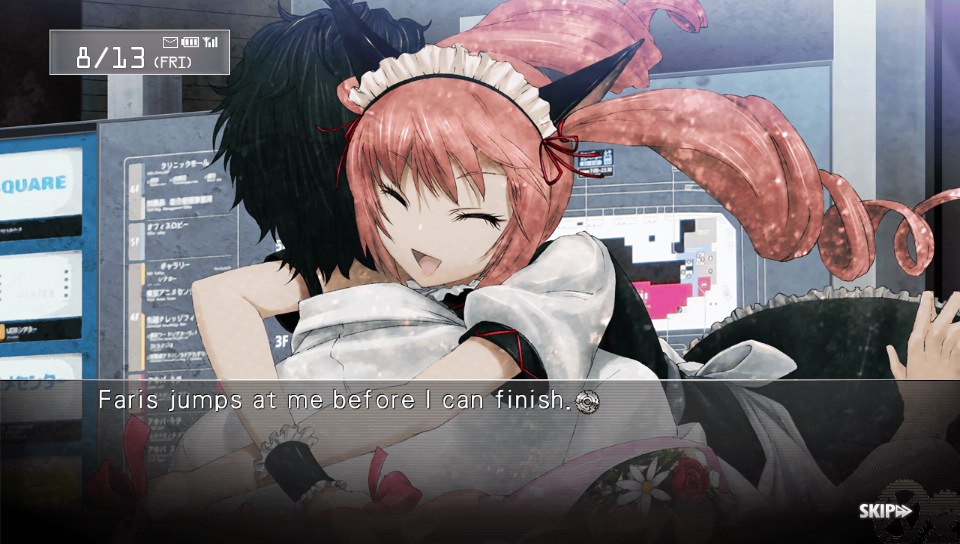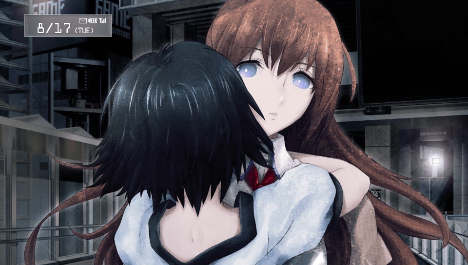 I finally used an FAQ to navigate my way to this ending—and boy, don’t I regret it. The requirements for the unlocking of “Open the Steins Gate” are ridiculously arcane, and I’m pretty sure that I would have given up on the game long before triggering them. Here’s the deal: you must build a relationship with Kurisu that will prove intense and enduring enough to motivate future Okabe on worldline Beta to dive again into time-travel research and find a way to set things rights after Kurisu’s death. This is done by exchanging a series of emails with Kurisu over the course of the game’s ten chapters, and the true ending flags are triggered by answering specific words in her emails—or, in one case, by not answering them. Aside from the fact that exchanging a couple of emails seems a trifle too superficial a way to strengthen a love bond, even in these digital times, these flags present a stinging problem: although they make perfect sense in the context of the True Ending, it is virtually impossible to guess what they are before uncovering said True Ending. You could spend dozens of hours trying to figure out which emails are relevant between Mayuri’s, Faris’, Lukako’s and Kurisu’s and trying every single possible combination of answers before unearthing the True Ending—that is, if you don’t get bored to death and jump ship long before. Things are all the more confusing as this flag system is only used for the True Ending and it corollary, the truncated “Paradox Meltdown”, while the other four endings use a branching path system. Maybe this is common practice in the realm of Visual Novels, but it is quite confusing for a beginner like me. 9 Hours 9 Persons 9 Doors, which is the closest thing to a VN I’ve played before Steins;Gate, used a branching path system and stuck to it; as a result, it was much more satisfying to navigate and the uncovering of the various endings was much smoother. There was a flag of sorts to unearth, granted, but it was only a single occurrence and it made perfect sense in the context of the narrative, so guessing what this flag was and recovering it was piece of cake. On the other hand, the lack of cohesiveness of Steins;Gate’s ending requirements and the arcane quality of its flag system forces you to rely on trial-and-errors—or FAQs as a last resort—which is anything but fulfilling.